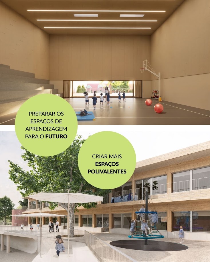 🔹 Salas de aulas + espaço polivalente com ginásio, bancada e abertura para o exterior
