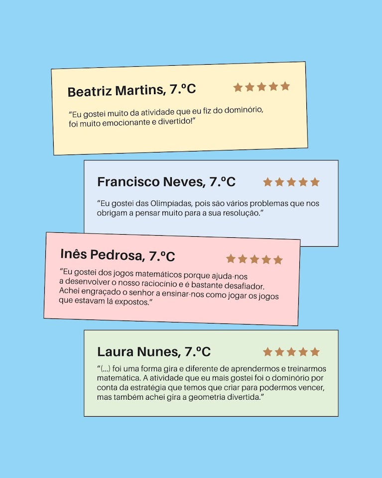 Durante a semana, falámos de “Relógios de Sol e Matemática”. Interagimos com um inventor e produtor de jogos e enigmas. Experimentámos magia, balões e origamis. Discutimos política, eleições, saúde, estruturas de edifícios e cadeias de abastecimento. Participámos em escape rooms, gincanas e jogos que desafiam o raciocínio. Competimos a fazer contas, resolver problemas, Jogos Matemáticos e Xadrez. E assim demos o mote para um ano letivo onde a matemática assume um papel crucial.
