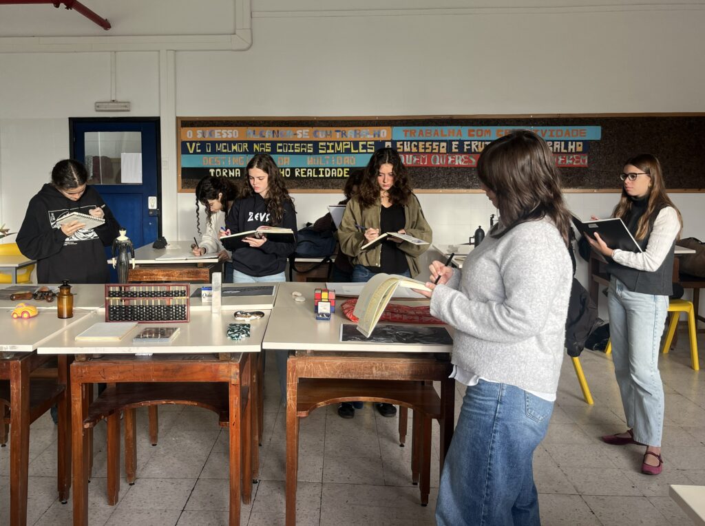 Estas sessões conjuntas estão estruturadas em torno de um conjunto variado de objetos que poderiam pertencer a um Museu. Cada aula abre um novo ângulo sobre o tema, e cada contacto com os objetos – seja um desenho de Graça Morais ou um vinil de Chico Buarque, uma máscara angolana, um cravo vermelho, um walkman ou uma caneta Bic – revela diferentes noções de valor e múltiplas possibilidades de associação. As alunas são desafiadas a observar, tocar, selecionar, desenhar, estudar, interpretar, relacionar e justificar as suas escolhas. A seleção revela-se num gesto intuitivo e criativo, em que a curiosidade – motor da prática curatorial – desempenha um papel central. Os objetos escolhidos são manuseados com luvas, introduzindo noções de cuidado, proximidade e responsabilidade, fundamentais ao trabalho museológico. As questões de resposta aberta orientam uma aproximação assente na observação atenta, na interpretação criativa e na discussão em grupo. A articulação do desenho com a palavra aprofunda a perceção, permite identificar semelhanças e diferenças, refletir sobre origem, matéria e valor, e reconhecer a pluralidade de sentidos e tempos que cada objeto transporta. Como lembrava Leonardo da Vinci, “arte é coisa mental”, e é precisamente nessa relação entre o olhar, o traço e o pensamento que se revela a verdadeira profundidade da experiência artística.
