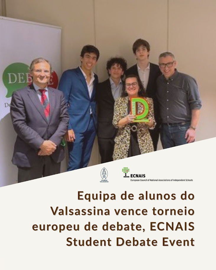 Após três rondas intensas de debate, a equipa do Colégio Valsassina, constituída pelos alunos Gustavo Ferreira (11.º ano), Mateus Silva (12.º ano) e Vasco Isidoro (12.º ano), destacou-se pelo rigor argumentativo e pela clareza de comunicação, garantindo um lugar na final e conquistando a grande vitória.