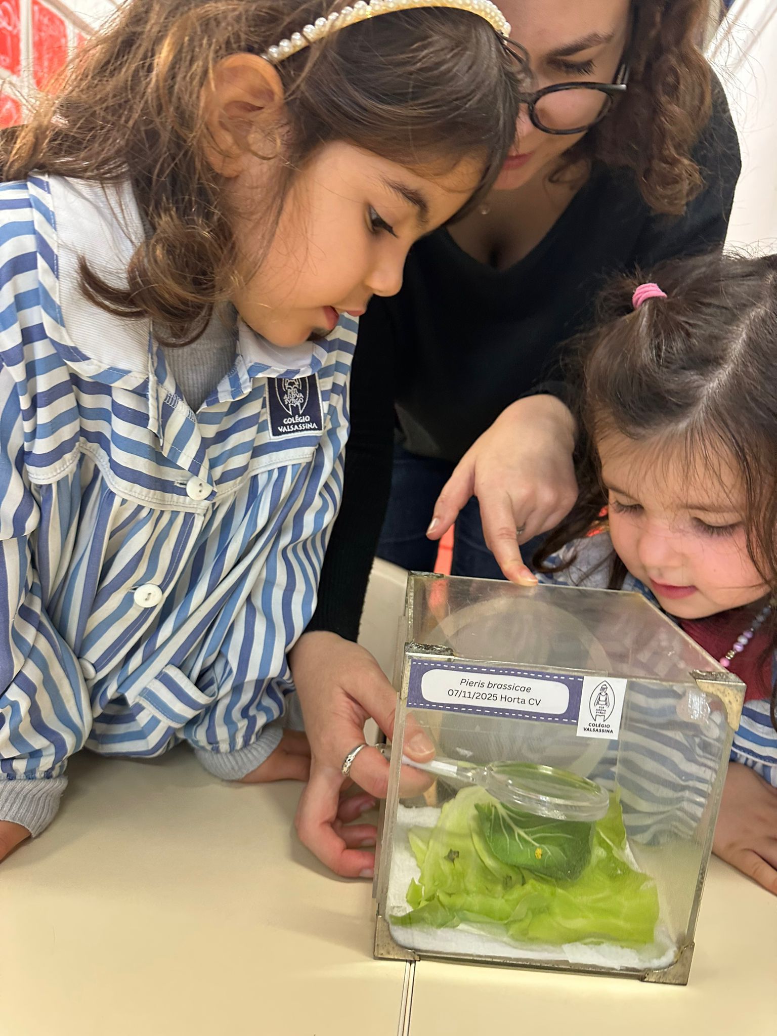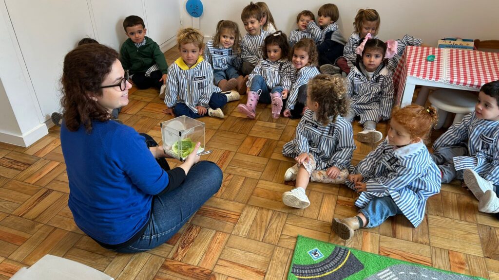 As couves plantadas pelos alunos do Jardim de Infância na horta do Colégio atraíram borboletas brancas da couve (Pieris brassicae) que se apressaram a depositar os seus ovos, de forma gregária, em várias folhas. Estes ovos foram recolhidos e guardados em duas caixas de criação. De seguida, as nove turmas do Jardim de Infância ouviram a história d’A lagartinha muito comilona (Carle, 1969) e, com a ajuda de cada Educadora, observaram uma caixa transparente que continha uma grande folha verde. “É alface!” – disseram algumas vozes curiosas. Era, afinal, uma folha de couve. Com o auxílio de uma lupa, os alunos identificaram a primeira observação: “São muitos ovinhos amarelos!” Com ainda mais atenção, foram ainda capazes de observar outra forma: pequenas lagartas com cerca de dois dias de vida. “São muito pequeninas!” – notaram, espantados com aquelas criaturas minúsculas. As lagartas de Pieris brassicae são comummente consideradas uma praga agrícola, uma vez que podem ter efeitos devastadores nas culturas. Para estas crianças, no entanto, o conceito de “praga” será ainda alheio – talvez seja este um dos motivos que as fará afirmar peremptoriamente que “estas lagartas são lindas”. Na turma da educadora Ana Pereira 5 anos B, enquanto observamos os ovos, surge uma pergunta: “Onde está a mãe deles?” É explicado aos alunos que a mãe destes ovos foi uma borboleta que pousou na folha, pôs os ovos, e voou novamente. “Podemos ir procurar a mãe deles?” – Perguntam. Mas são os alunos do Jardim de Infância que estão agora responsáveis por cuidar destes ovos e das lagartas acabadas de nascer. É preciso observar diariamente e, ocasionalmente, alimentar as lagartas com uma folha de couve que a cozinha do Colégio nos guarda. Estas lagartas estão agora ao cuidado de todos, para que todos possam observar, acompanhar e registar o desenvolvimento destes seres. Na turma da educadora Sofia Linhares 3 anos C, um dos alunos sublinha o que não se pode fazer aos ovos: “Não podemos tocar, nem apertar, nem bater”. Já na turma da educadora Vera Alves 4 anos A, o Lourenço explica por que não podemos tocar nos pequenos ovos: se tocarmos, “também ficamos pequeninos”. A história da “lagartinha” de Carle, que muitos alunos já conheciam, permitiu que