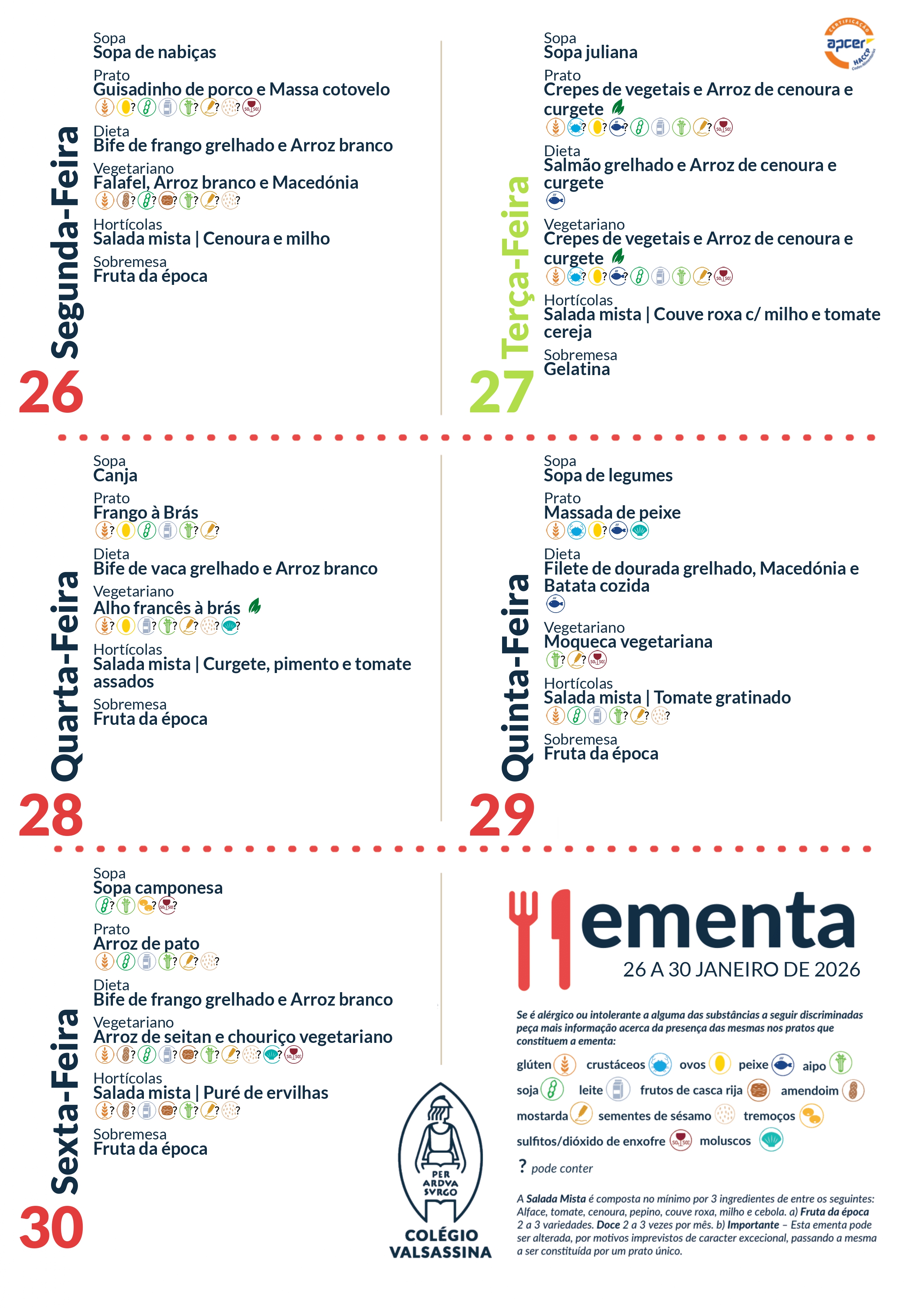 Todos os meses, na última terça-feira de cada mês, o refeitório do Colégio Valsassina irá proporcionar um prato vegetariano como prato principal.